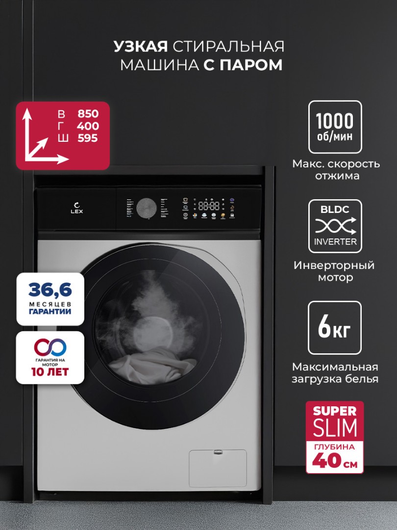 Новая линейка стиральных машин LEX серии Slim — это стильный, надежный и высокотехнологичный помощник для вашего дома, который прослужит вам верой и правдой долгие годы благодаря инверторному мотору и комплектующим высокого качества.