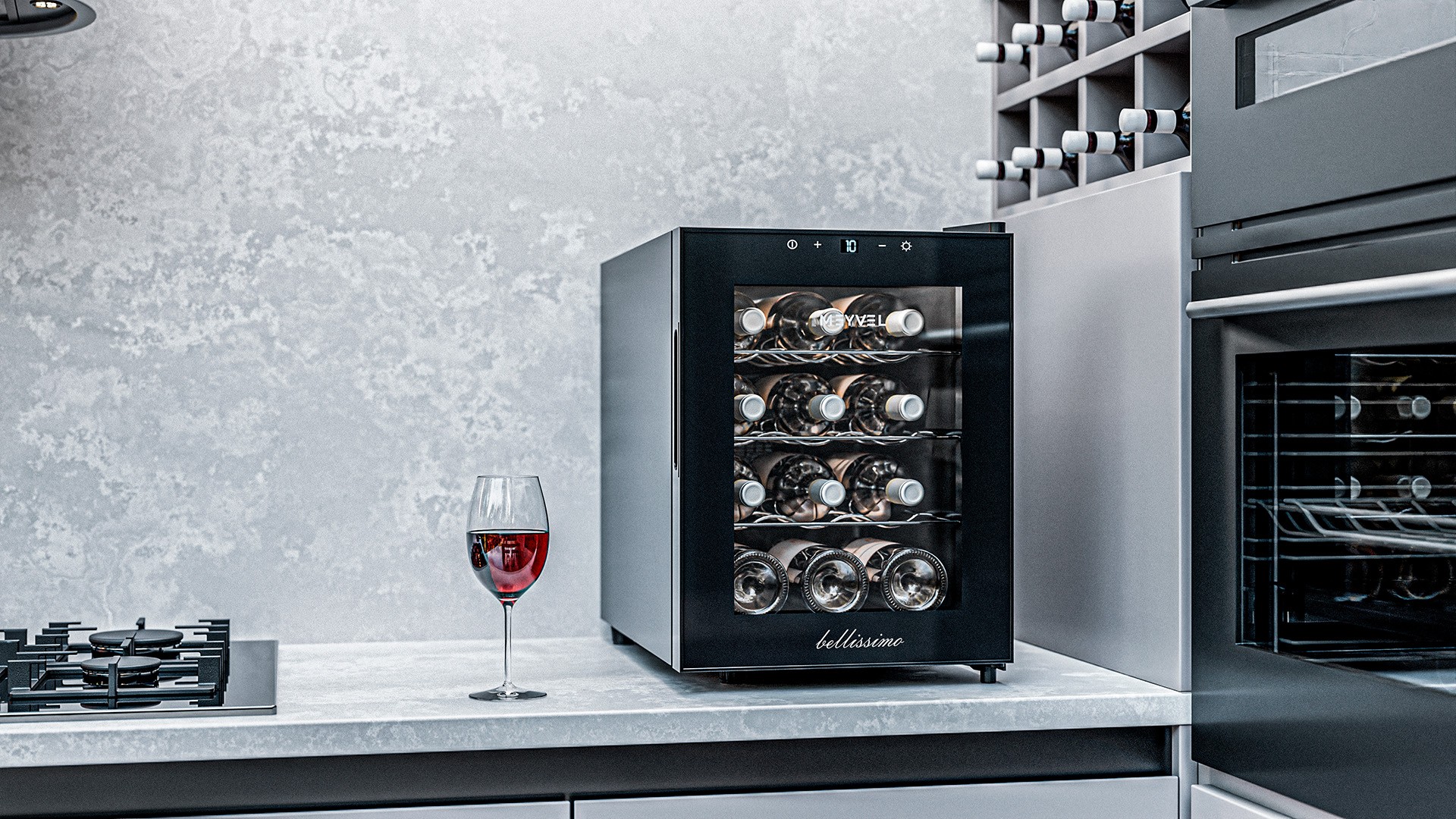 Несмотря на компактность, внутреннее устройство продумано до мелочей. Три металлические полки рассчитаны на стандартные бутылки «Бордо», а мягкая подсветка включается и выключается кнопкой, поэтому нужная бутылка найдётся даже вечером.